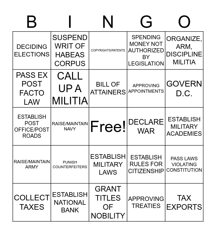 This bingo card has a free space and 29 words: COLLECT TAXES, BORROW MONEY, RAISE/MAINTAIN NAVY, PUNISH PIRACY, DECIDING ELECTIONS, COPYRIGHTS/PATENTS, CALL UP A MILITIA, PUNISH COUNTERFEITERS, DECLARE WAR, ESTABLISH NATIONAL BANK, ESTABLISH MILITARY ACADEMIES, TAX EXPORTS, GRANT TITLES OF NOBILITY, APPROVING TREATIES, GOVERN D.C., COIN MONEY/SET WEIGHTS & MEASURES STANDARDS, ESTABLISH MILITARY LAWS, RAISE/MAINTAIN ARMY, ORGANIZE, ARM, DISCIPLINE MILITIA, ESTABLISH POST OFFICE/POST ROADS, ESTABLISH RULES FOR CITIZENSHIP, IMPEACHING OFFICIALS, APPROVING APPOINTMENTS, PASS EX POST FACTO LAW, SPENDING MONEY NOT AUTHORIZED BY LEGISLATION, SUSPEND WRIT OF HABEAS CORPUS, PASS LAWS VIOLATING CONSTITUTION, BILL OF ATTAINERS and PASS LAWS GIVING STATES/GROUPS UNFAIR TRADE ADVANTAGES.