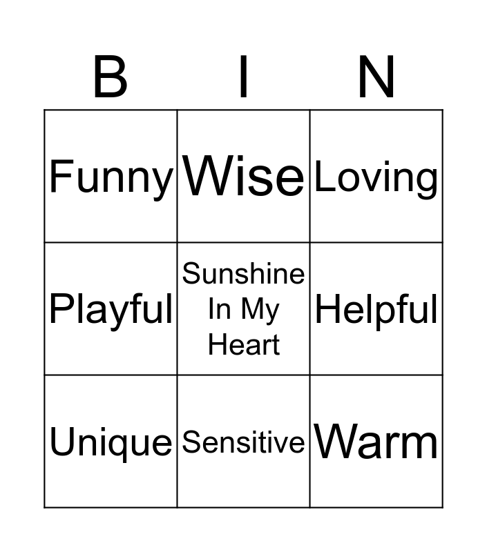 This bingo card has a free space and 14 words: Caring, Supportive, Helpful, Funny, Loving, Playful, Listening, Perceptive, Trust, Wise, Warm, Unique, Sensitive and Differences are Fun!!.