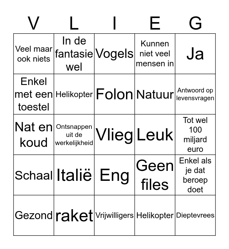 This bingo card has a free space and 24 words: Italië, raket, Folon, Gezond, Ja, Veel maar ook niets, Enkel met een toestel, In de fantasie wel, Leuk, Eng, Natuur, Nat en koud, Geen files, Enkel als je dat beroep doet, Helikopter, Helikopter, Tot wel 100 miljard euro, Vogels, Antwoord op levensvragen, Ontsnappen uit de werkelijkheid, Dieptevrees, Schaal, Kunnen niet veel mensen in and Vrijwilligers.