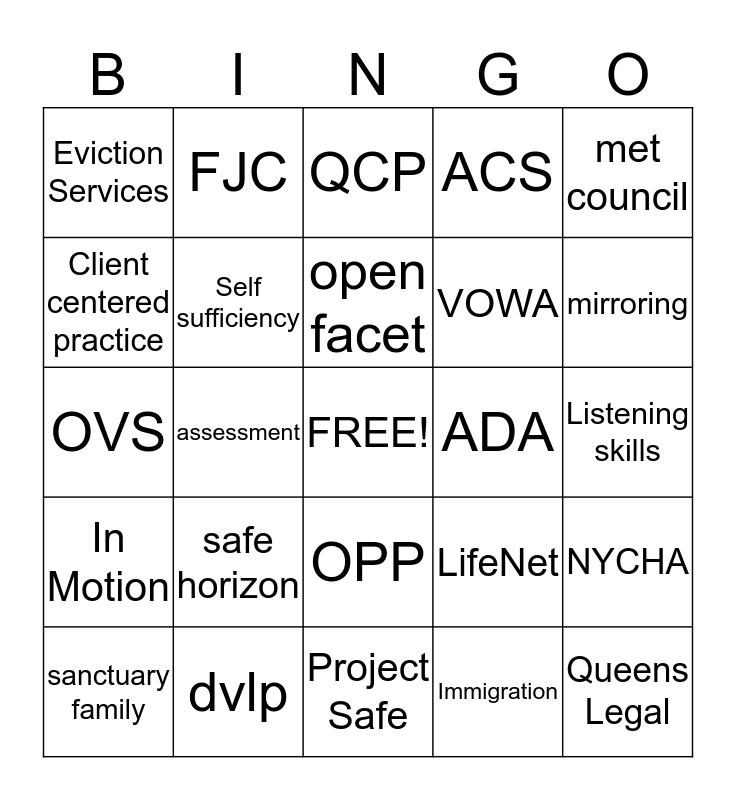 This bingo card has a free space and 24 words: safe horizon, dvlp, open facet, sanctuary family, met council, Eviction Services, Client centered practice, FJC, ADA, OPP, VOWA, OVS, LifeNet, NYCHA, Self sufficiency, Immigration, Listening skills, QCP, mirroring, assessment, Queens Legal, In Motion, ACS and Project Safe.