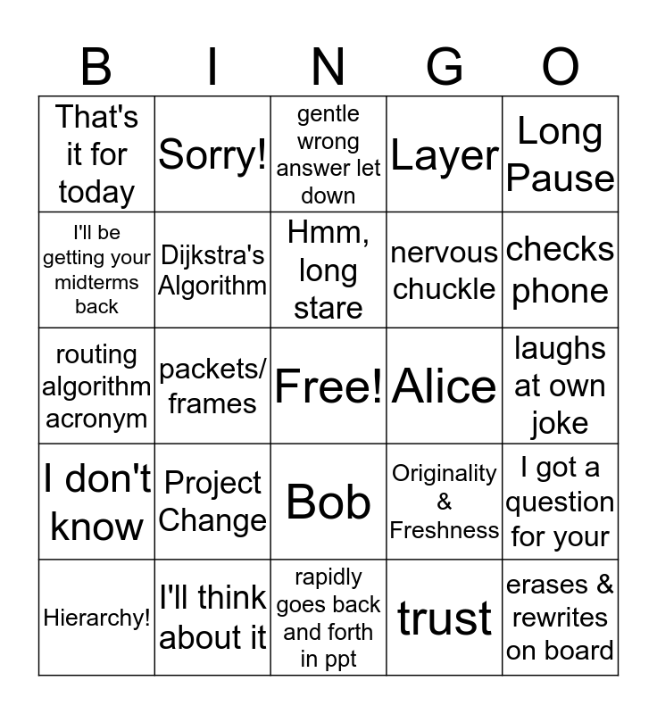 This bingo card has a free space and 24 words: Project Change, I'll think about it, Hmm, long stare, Hierarchy!, Long Pause, That's it for today, I'll be getting your midterms back, Sorry!, Alice, Bob, nervous chuckle, routing algorithm acronym, Originality & Freshness, I got a question for your, Dijkstra's Algorithm, trust, laughs at own joke, gentle wrong answer let down, checks phone, packets/ frames, erases & rewrites on board, I don't know, Layer and rapidly goes back and forth in ppt.
