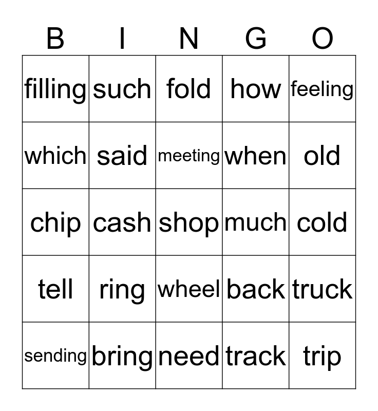 This bingo card has a free space and 24 words: ring, bring, meeting, sending, feeling, filling, which, such, much, wheel, when, chip, back, truck, said, track, cold, fold, old, cash, trip, tell, how and need.