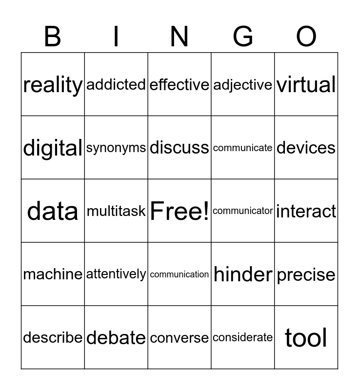 This bingo card has a free space and 24 words: attentively, debate, discuss, describe, virtual, reality, digital, addicted, communicator, communication, communicate, data, hinder, precise, synonyms, considerate, interact, effective, devices, multitask, tool, machine, adjective and converse.