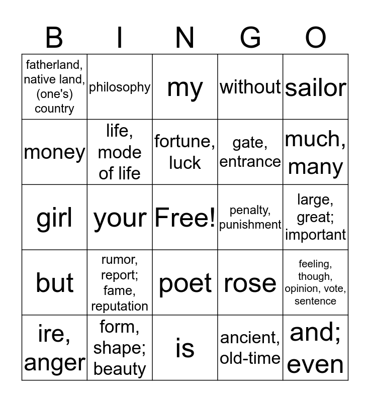 This bingo card has a free space and 24 words: rumor, report; fame, reputation, form, shape; beauty, fortune, luck, ire, anger, sailor, fatherland, native land, (one's) country, money, philosophy, penalty, punishment, poet, gate, entrance, girl, rose, feeling, though, opinion, vote, sentence, life, mode of life, ancient, old-time, large, great; important, my, much, many, your, and; even, but, without and is.