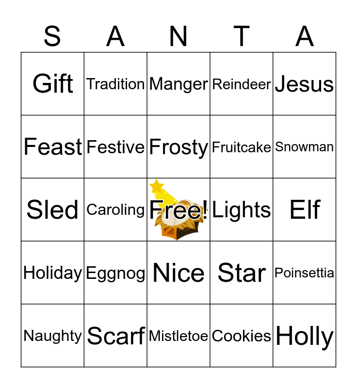 This bingo card has a free space and 45 words: Presents, Holly, Snow, Naughty, Jingle Bells, Cookies, Manger, Rejoice, Jesus, Scarf, Reindeer, Lights, Nice, Eggnog, Ornaments, Mistletoe, Pine Cone, Sled, Jolly, Snowman, Tradition, Rudolph, Jack Frost, Gift, Chilly, Elf, Family, Garland, Star, Holiday, Saint Nick, Poinsettia, Christmas Tree, Toys, Mittens, Caroling, Noel, Mrs.Claus, Joy, Frosty, Feast, Fruitcake, Season, Festive and Hot Chocolate.