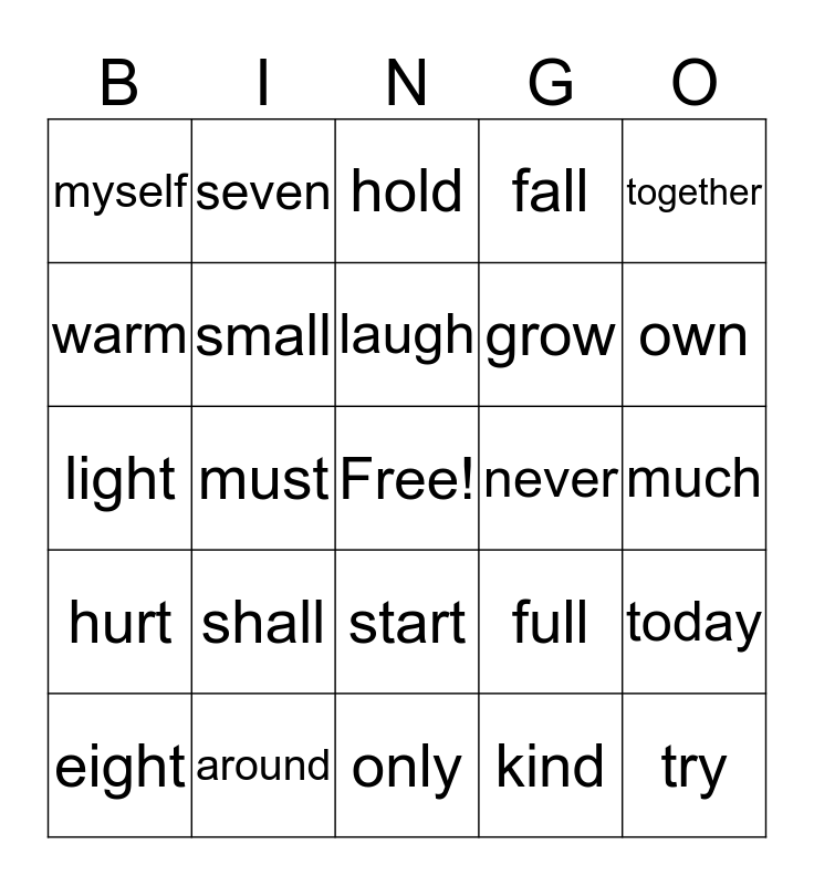 This bingo card has a free space and 24 words: shall, around, laugh, eight, together, myself, warm, seven, never, start, grow, light, full, today, small, kind, much, hold, own, must, try, hurt, fall and only.