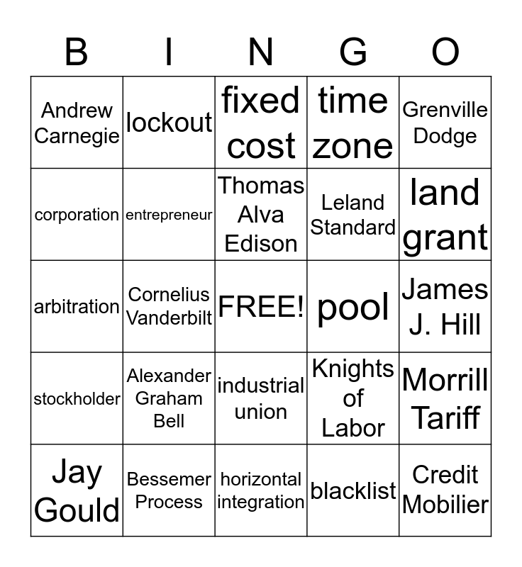 This bingo card has a free space and 38 words: GNP, Edwin Drake, laissez-faire, entrepreneur, Morrill Tariff, Alexander Graham Bell, Thomas Alva Edison, Pacific Railway Act, Grenville Dodge, Leland Standard, Cornelius Vanderbilt, time zone, Credit Mobilier, James J. Hill, corporation, stockholder, economies of scale, fixed cost, operating cost, pool, Andrew Carnegie, Bessemer Process, land grant, Jay Gould, vertical integration, horizontal integration, monopoly, trust, holding company, deflation, trade union, industrial union, blacklist, lockout, Marxism, Knights of Labor, arbitration and closed shop.