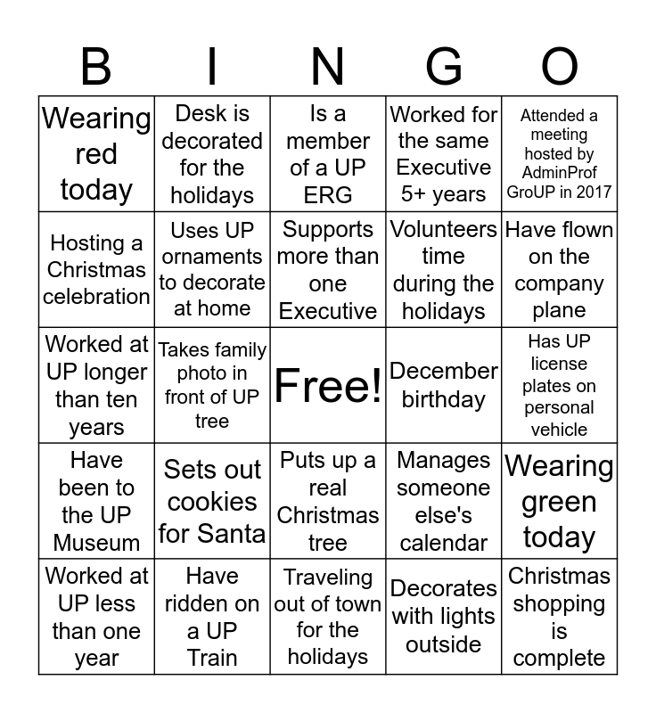 This bingo card has a free space and 24 words: Sets out cookies for Santa, Have ridden on a UP Train, Supports more than one Executive, Worked at UP less than one year, Attended a meeting hosted by AdminProf GroUP in 2017, Wearing red today, Hosting a Christmas celebration, Desk is decorated for the holidays, December birthday, Puts up a real Christmas tree, Volunteers time during the holidays, Worked at UP longer than ten years, Manages someone else's calendar, Wearing green today, Uses UP ornaments to decorate at home, Decorates with lights outside, Has UP license plates on personal vehicle, Is a member of a UP ERG, Have flown on the company plane, Takes family photo in front of UP tree, Christmas shopping is complete, Have been to the UP Museum, Worked for the same Executive 5+ years and Traveling out of town for the holidays.