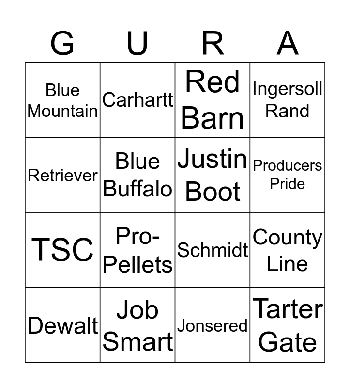 This bingo card has 16 words: Job Smart, County Line, Red Barn, Blue Mountain, TSC, Carhartt, Schmidt, Jonsered, Retriever, Blue Buffalo, Dewalt, Ingersoll Rand, Pro-Pellets, Producers Pride, Justin Boot and Tarter Gate.