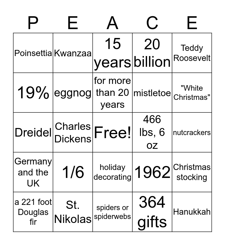 This bingo card has a free space and 24 words: 1/6, St. Nikolas, for more than 20 years, a 221 foot Douglas fir, Teddy Roosevelt, Poinsettia, 19%, Kwanzaa, 466 lbs, 6 oz, holiday decorating, mistletoe, Dreidel, 1962, Christmas stocking, eggnog, 364 gifts, nutcrackers, 15 years, "White Christmas", Charles Dickens, Hanukkah, Germany and the UK, 20 billion and spiders or spiderwebs.