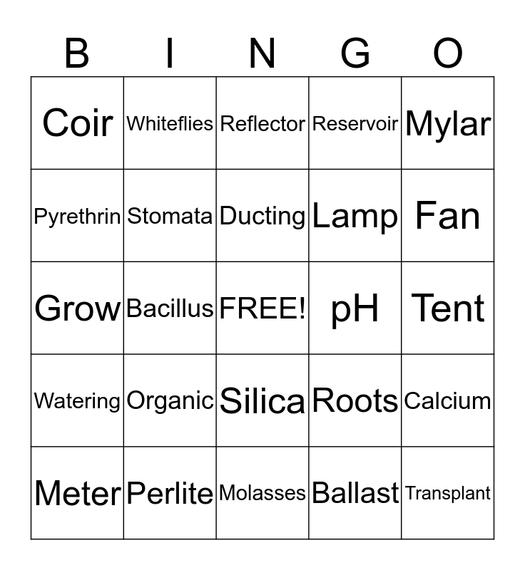 This bingo card has a free space and 24 words: Organic, Perlite, Ducting, Meter, Mylar, Coir, Pyrethrin, Whiteflies, pH, Silica, Lamp, Grow, Roots, Calcium, Stomata, Ballast, Tent, Reflector, Fan, Bacillus, Transplant, Watering, Reservoir and Molasses.