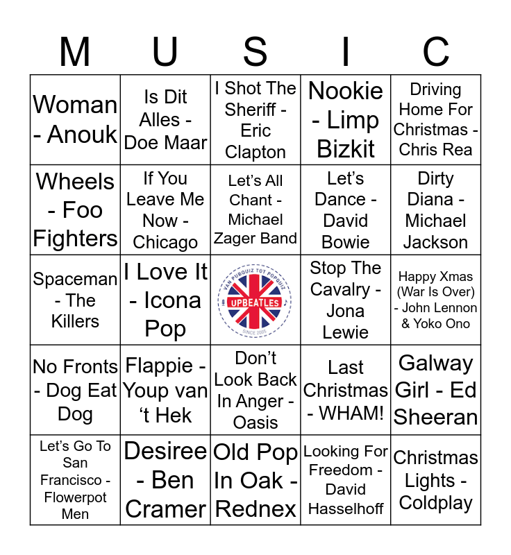 This bingo card has a free space and 24 words: Flappie - Youp van ‘t Hek, Desiree - Ben Cramer, Let’s All Chant - Michael Zager Band, Let’s Go To San Francisco - Flowerpot Men, Driving Home For Christmas - Chris Rea, Woman - Anouk, Wheels - Foo Fighters, Is Dit Alles - Doe Maar, Stop The Cavalry - Jona Lewie, Don’t Look Back In Anger - Oasis, Let’s Dance - David Bowie, Spaceman - The Killers, Last Christmas - WHAM!, Galway Girl - Ed Sheeran, If You Leave Me Now - Chicago, Looking For Freedom - David Hasselhoff, Happy Xmas (War Is Over) - John Lennon & Yoko Ono, I Shot The Sheriff - Eric Clapton, Dirty Diana - Michael Jackson, I Love It - Icona Pop, Christmas Lights - Coldplay, No Fronts - Dog Eat Dog, Nookie - Limp Bizkit and Old Pop In Oak - Rednex.
