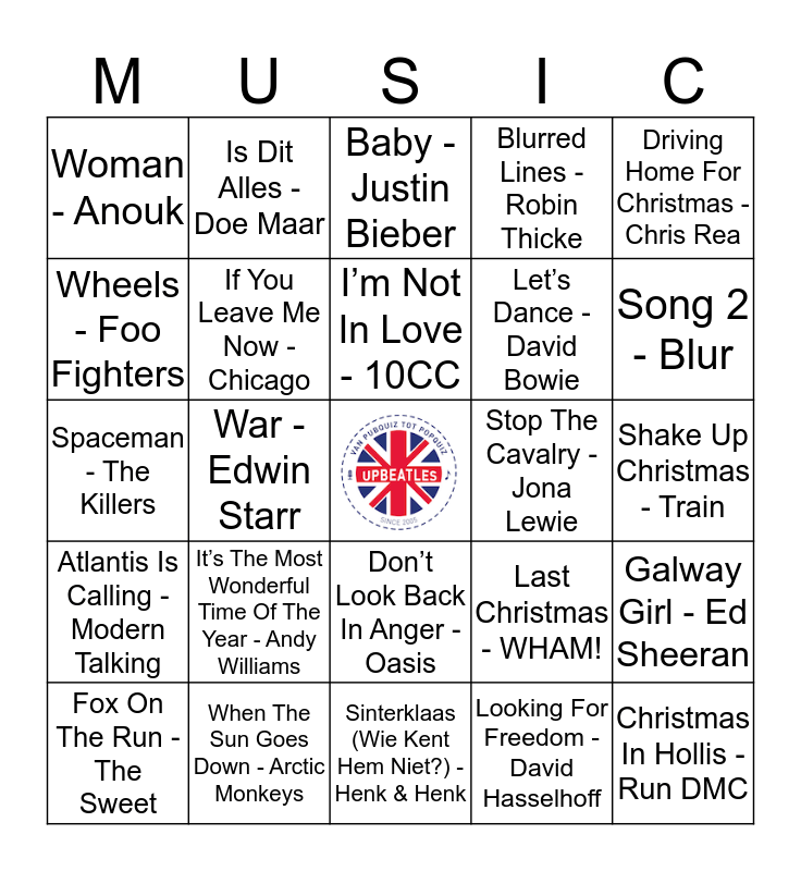 This bingo card has a free space and 24 words: It’s The Most Wonderful Time Of The Year - Andy Williams, When The Sun Goes Down - Arctic Monkeys, I’m Not In Love - 10CC, Fox On The Run - The Sweet, Driving Home For Christmas - Chris Rea, Woman - Anouk, Wheels - Foo Fighters, Is Dit Alles - Doe Maar, Stop The Cavalry - Jona Lewie, Don’t Look Back In Anger - Oasis, Let’s Dance - David Bowie, Spaceman - The Killers, Last Christmas - WHAM!, Galway Girl - Ed Sheeran, If You Leave Me Now - Chicago, Looking For Freedom - David Hasselhoff, Shake Up Christmas - Train, Baby - Justin Bieber, Song 2 - Blur, War - Edwin Starr, Christmas In Hollis - Run DMC, Atlantis Is Calling - Modern Talking, Blurred Lines - Robin Thicke and Sinterklaas (Wie Kent Hem Niet?) - Henk & Henk.