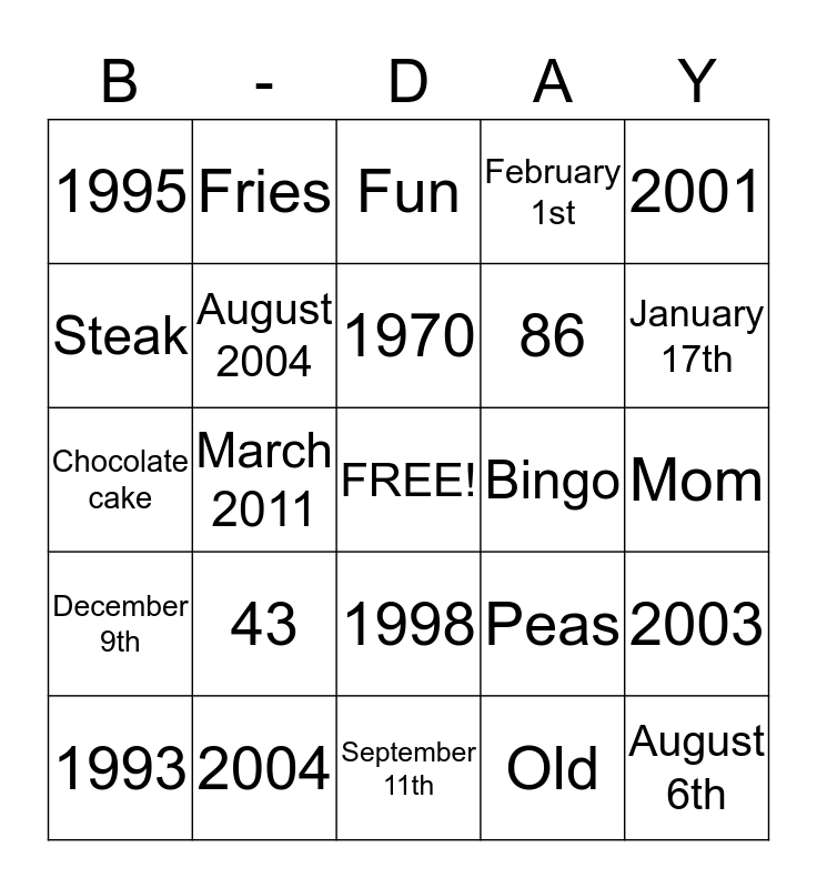 This bingo card has a free space and 24 words: 43, 2004, 1970, 1993, 2001, 1995, Steak, Fries, Bingo, 1998, 86, Chocolate cake, Peas, 2003, August 2004, Old, Mom, Fun, January 17th, March 2011, August 6th, December 9th, February 1st and September 11th.