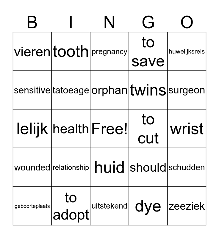 This bingo card has a free space and 24 words: relationship, to adopt, orphan, geboorteplaats, huwelijksreis, vieren, sensitive, tooth, to cut, huid, twins, lelijk, should, schudden, tatoeage, dye, wrist, pregnancy, surgeon, health, zeeziek, wounded, to save and uitstekend.