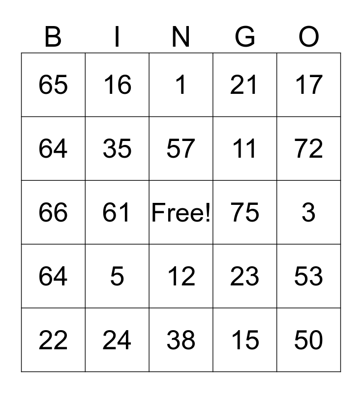 This bingo card has a free space and 24 words: 22, 5, 57, 15, 17, 65, 16, 1, 75, 3, 66, 35, 23, 53, 64, 24, 38, 21, 72, 64, 61, 12, 11 and 50.