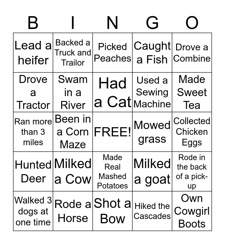 This bingo card has a free space and 24 words: Milked a Cow, Rode a Horse, Had a Cat, Walked 3 dogs at one time, Drove a Combine, Lead a heifer, Drove a Tractor, Backed a Truck and Trailor, Mowed grass, Made Real Mashed Potatoes, Used a Sewing Machine, Ran more than 3 miles, Milked a goat, Rode in the back of a pick-up, Swam in a River, Hiked the Cascades, Collected Chicken Eggs, Picked Peaches, Made Sweet Tea, Been in a Corn Maze, Own Cowgirl Boots, Hunted Deer, Caught a Fish and Shot a Bow.