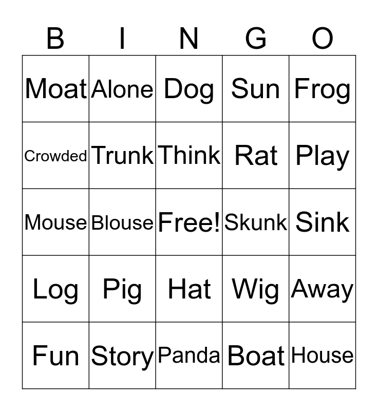 This bingo card has a free space and 24 words: Pig, Story, Think, Fun, Frog, Moat, Crowded, Alone, Skunk, Hat, Rat, Mouse, Wig, Away, Trunk, Boat, Sink, Dog, Play, Blouse, House, Log, Sun and Panda.