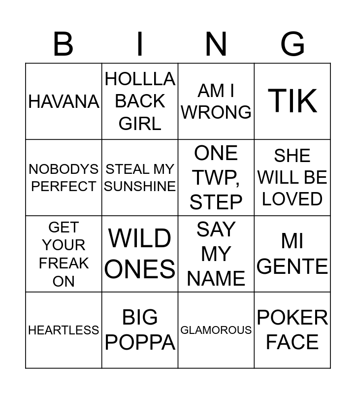 This bingo card has 18 words: WILD ONES, POKER FACE, AM I WRONG, HAVANA, SAY MY NAME, TIK, HEARTLESS, HOLLLA BACK GIRL, SHE WILL BE LOVED, GET YOUR FREAK ON, GLAMOROUS, NOBODYS PERFECT, MI GENTE, STEAL MY SUNSHINE, ONE TWP, STEP, CALIFORNIA GIRLS, BIG POPPA and KISS ME.