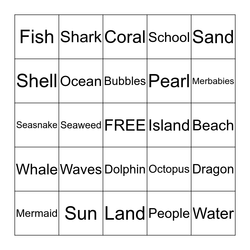 This bingo card has a free space and 29 words: Mermaid, Merman, Seaweed, Tail, Fish, Coral, Ocean, Waves, Island, Sun, Beach, Water, Land, People, Merbabies, Egg, Dolphin, Whale, Sand, Seasnake, Octopus, Crab, Pearl, Shell, School, Shark, Dragon, Bubbles and Swim.