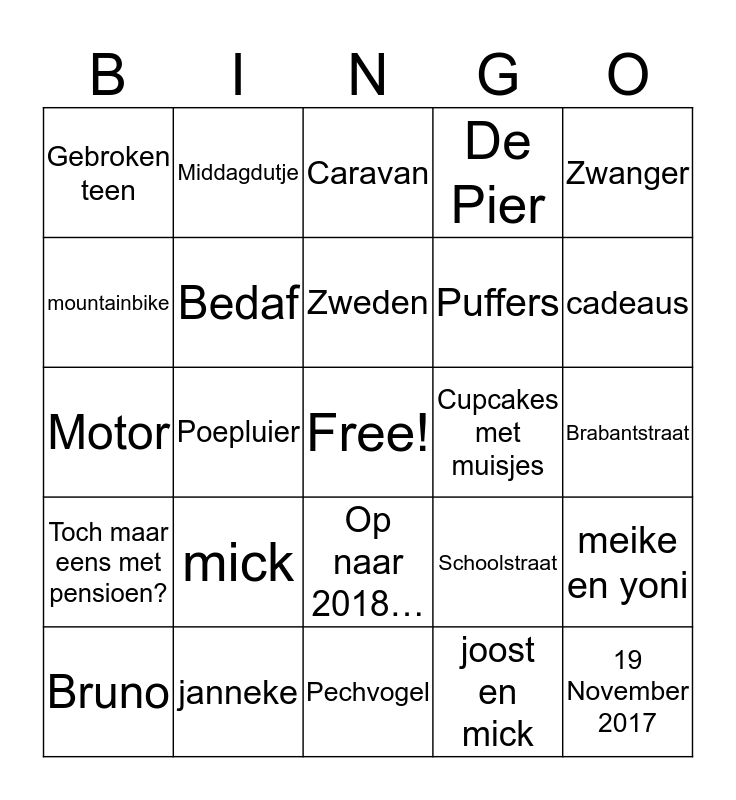 This bingo card has a free space and 56 words: 4 april 2017, Bruno, Schouderbreuk, Gebroken teen, Pechvogel, (thuiszorg), Bedaf, Fysiotherapie, Puffers, Spit, De Pier, Campingsmoking, Verbouwing, Verhuisdoos, Fietsendragers, Goossens, Zwanger, Poepluier, Konijn, 19 November 2017, Cupcakes met muisjes, Verhuizing, Schoolstraat, Caravan, Grote Boel, Zweden, pepernoten, Chocoladeletter, cadeaus, sinterklaas, Zwarte Piet, 5 december, Schoonmaakster, Leeuwstraat, Brabantstraat, mountainbike, Motor, Manenblussers, Toch maar eens met pensioen?, Middagdutje, Op naar 2018…, joost, moniek, meike, yoni, mick, janneke, toon, wilma, janneke en mick, joost en mick, moniek en mick, opa en oma en mick, meike en mick, meike en yoni and joost en moniek.
