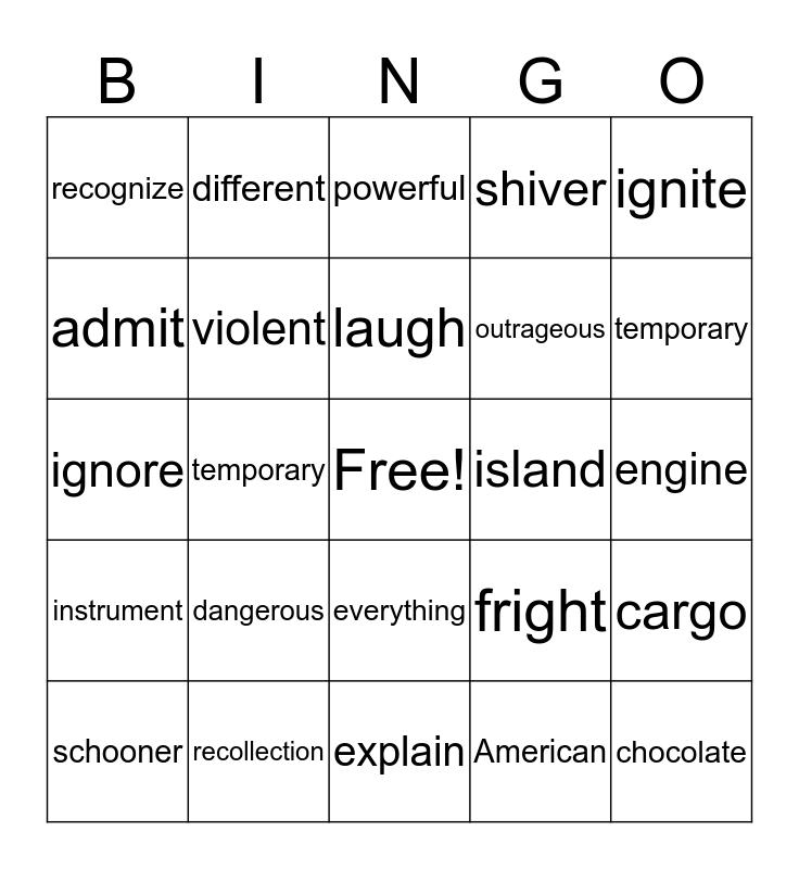 This bingo card has a free space and 26 words: everything, American, laugh, recollection, ignite, recognize, admit, different, engine, fright, outrageous, ignore, cargo, schooner, temporary, sizzle, shiver, instrument, powerful, chocolate, temporary, explain, island, dangerous, violent and knowledge.