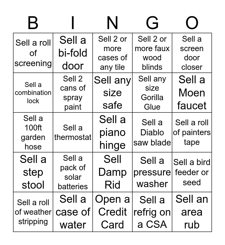 This bingo card has 25 words: Sell a pack of solar batteries, Open a Credit Card, Sell any size safe, Sell a roll of weather stripping, Sell a screen door closer, Sell a roll of screening, Sell a combination lock, Sell a bi-fold door, Sell a Diablo saw blade, Sell Damp Rid, Sell any size Gorilla Glue, Sell a 100ft garden hose, Sell a pressure washer, Sell a bird feeder or seed, Sell 2 cans of spray paint, Sell an area rub, Sell a roll of painters tape, Sell 2 or more cases of any tile, Sell a Moen faucet, Sell a thermostat, Sell a piano hinge, Sell a case of water, Sell a step stool, Sell 2 or more faux wood blinds and Sell a refrig on a CSA.