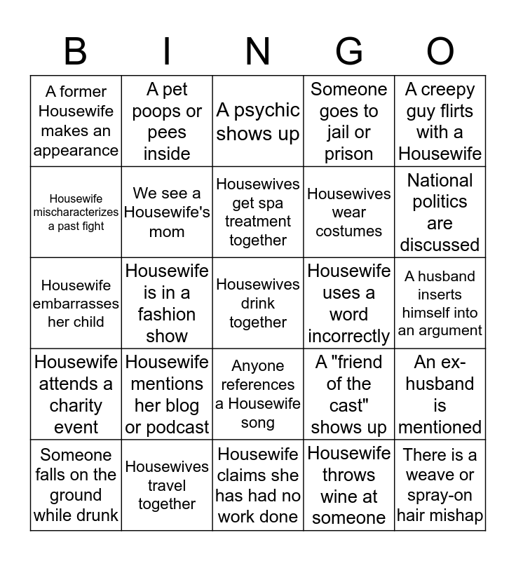 This bingo card has a free space and 24 words: Housewife mentions her blog or podcast, Housewives travel together, Housewives get spa treatment together, Someone falls on the ground while drunk, A creepy guy flirts with a Housewife, A former Housewife makes an appearance, Housewife mischaracterizes a past fight, A pet poops or pees inside, Housewife uses a word incorrectly, Anyone references a Housewife song, Housewives wear costumes, Housewife embarrasses her child, A "friend of the cast" shows up, An ex-husband is mentioned, We see a Housewife's mom, Housewife throws wine at someone, A husband inserts himself into an argument, A psychic shows up, National politics are discussed, Housewife is in a fashion show, There is a weave or spray-on hair mishap, Housewife attends a charity event, Someone goes to jail or prison and Housewife claims she has had no work done.