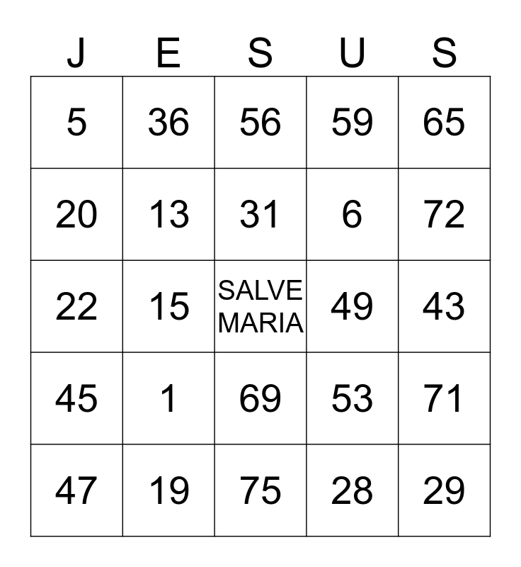 This bingo card has a free space and 24 words: 1, 19, 31, 47, 65, 5, 20, 36, 49, 69, 6, 22, 53, 71, 13, 28, 43, 56, 72, 15, 29, 45, 59 and 75.