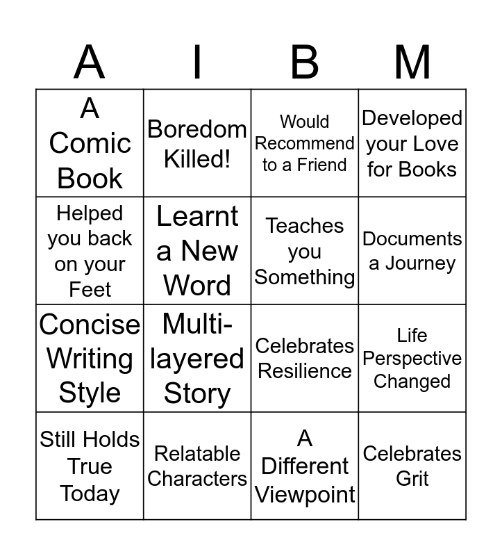 This bingo card has 16 words: Relatable Characters, Life Perspective Changed, Would Recommend to a Friend, A Comic Book, Concise Writing Style, Boredom Killed!, Celebrates Resilience, A Different Viewpoint, Helped you back on your Feet, Learnt a New Word, Still Holds True Today, Developed your Love for Books, Multi-layered Story, Documents a Journey, Teaches you Something and Celebrates Grit.