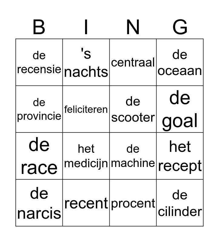 This bingo card has 38 words: het weekend, de frisbee, het team, de scooter, cool, de coach, de goal, het circuit, de provincie, de race, het recept, de oceaan, de narcis, procent, feliciteren, de cilinder, de decimeter, centraal, circa, recent, de recensie, de cello, het medicijn, de speculaas, de cake, het carnaval, de truc, het succes, het café, plastic, compleet, maandelijks, jaarlijks, 's nachts, 's woensdags, de chocolade, de machine and de chef.