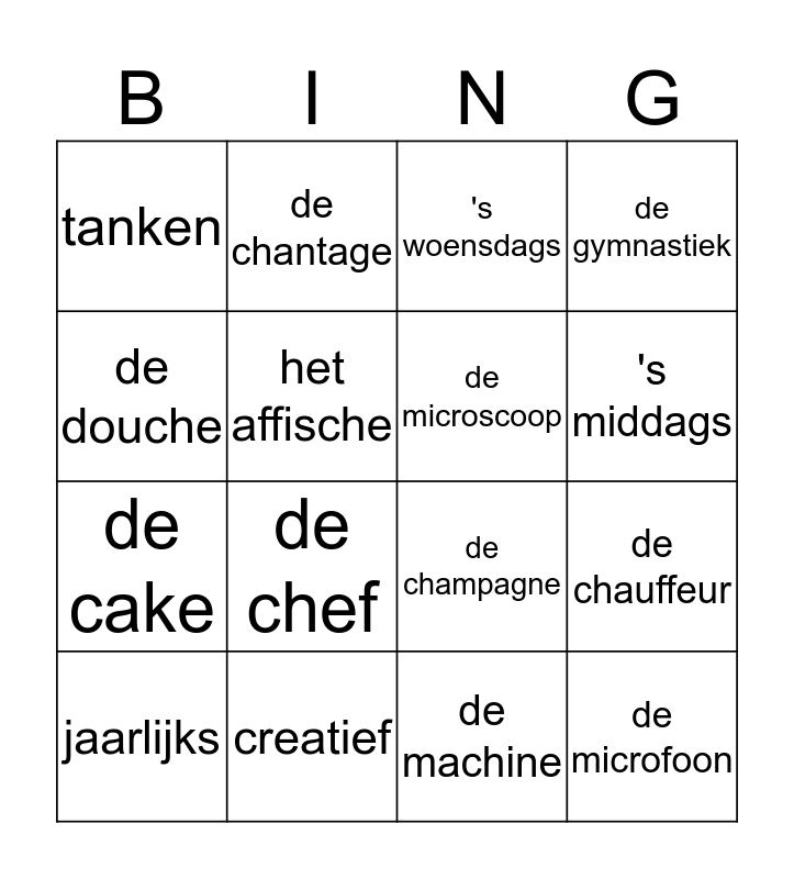 This bingo card has 42 words: 's morgens, 's middags, dinsdags, dagelijks, wekelijks, maandelijks, jaarlijks, 's nachts, 's woensdags, de chocolade, de machine, de chef, de chauffeur, de douche, de parachute, de chinees, de champignon, de champagne, de creche, de chantage, het affische, marcheren, de jam, tanken, de fanclub, de snackbar, de cake, de race, trainen, e-mailen, de keeper, de microfoon, de microscoop, het cadeau, het record, combineren, de conditie, creatief, de conducteur, de dynamo, de gymnastiek and gymmen.