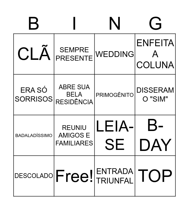 This bingo card has 21 words: Free!, COLUNÁVEIS, SEMPRE PRESENTE, LOOK, ENTRADA TRIUNFAL, PRIMOGÊNITO, CLÃ, WEDDING, LEIA-SE, DISSERAM O "SIM", BADALADÍSSIMO, ENFEITA A COLUNA, TOP, PARADISÍACO, ABRE SUA BELA RESIDÊNCIA, CONCORRIDO EVENTO, DESCOLADO, REUNIU AMIGOS E FAMILIARES, ERA SÓ SORRISOS, B-DAY and TEMPORADA.