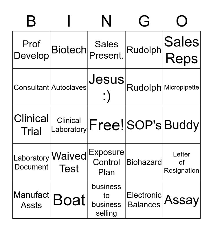 This bingo card has a free space and 24 words: Waived Test, Boat, Jesus :), Manufact Assts, Sales Reps, Prof Develop, Consultant, Biotech, SOP's, Exposure Control Plan, Rudolph, Clinical Trial, Biohazard, Letter of Resignation, Autoclaves, Electronic Balances, Buddy, Sales Present., Micropipette, Clinical Laboratory, Assay, Laboratory Document, Rudolph and business to business selling.
