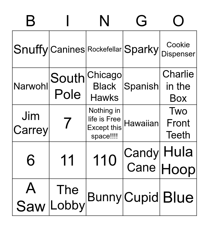 This bingo card has a free space and 24 words: 11, The Lobby, Chicago Black Hawks, A Saw, Cookie Dispenser, Snuffy, Narwohl, Canines, Hawaiian, 110, Spanish, Jim Carrey, Candy Cane, Hula Hoop, South Pole, Cupid, Two Front Teeth, Rockefellar, Charlie in the Box, 7, Blue, 6, Sparky and Bunny.