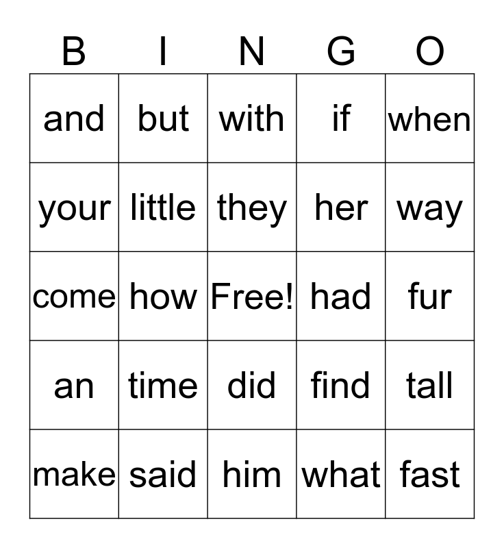This bingo card has a free space and 24 words: time, said, they, make, when, and, your, but, had, did, her, come, find, tall, little, what, fur, with, way, how, fast, an, if and him.