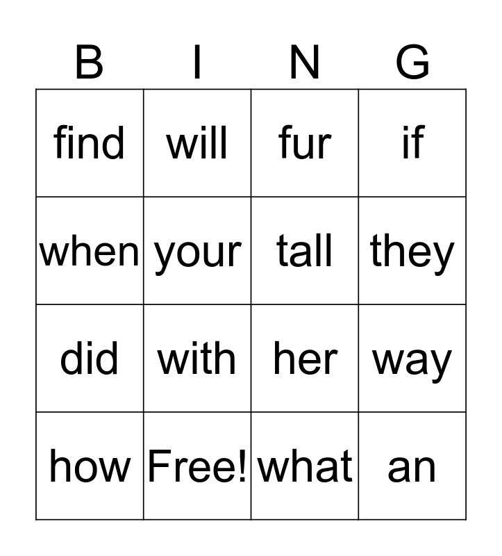 This bingo card has 25 words: time, said, they, make, when, find, your, will, Free!, how, did, her, come, find, tall, little, what, fur, with, way, how, fast, an, if and him.