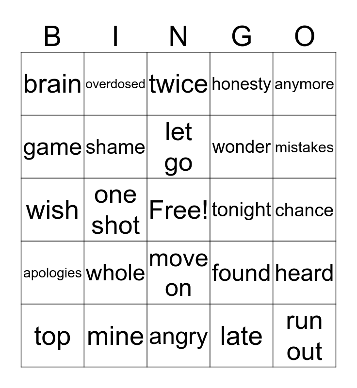 This bingo card has a free space and 24 words: whole, mine, let go, top, anymore, brain, game, overdosed, tonight, move on, wonder, wish, found, heard, shame, late, chance, twice, mistakes, one shot, run out, apologies, honesty and angry.