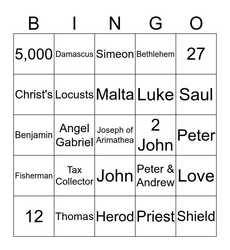 This bingo card has 25 words: Tax Collector, Herod, Malta, 12, 27, 5,000, Christ's, Damascus, 2 John, John, Luke, Benjamin, Peter & Andrew, Love, Locusts, Shield, Peter, Simeon, Saul, Angel Gabriel, Joseph of Arimathea, Thomas, Fisherman, Bethlehem and Priest.