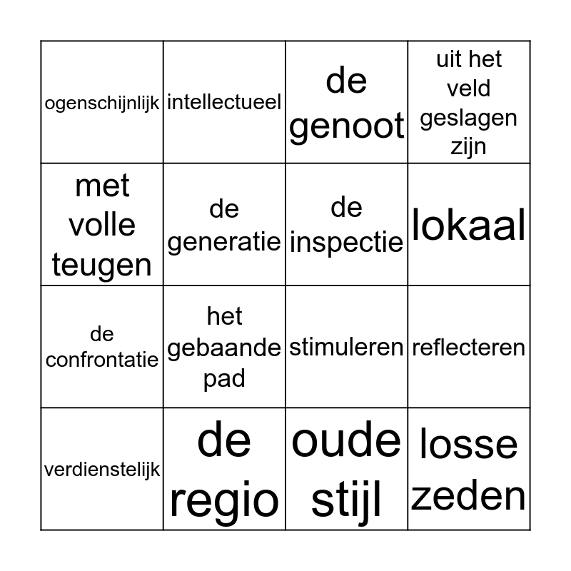 This bingo card has 27 words: in een adem noemen met, banaal, de confrontatie, de educatie, de generatie, de genoot, intellectueel, losse zeden, de regio, relatief, stimuleren, uit het veld geslagen zijn, het zwijgen opleggen, fris, het gebaande pad, indammen, de inspectie, lokaal, het ministerie, ogenschijnlijk, oude stijl, pontificaal, reflecteren, verdienstelijk, verzengend, met volle teugen and de wisselwerking.