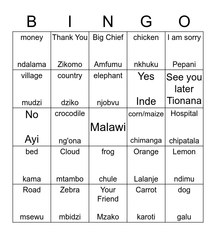 This bingo card has a free space and 24 words: Cloud mtambo, Zebra mbidzi, elephant njobvu, Road msewu, I am sorry Pepani, money ndalama, village mudzi, Thank You Zikomo, corn/maize chimanga, frog chule, Yes Inde, No Ayi, Orange Lalanje, Lemon ndimu, country dziko, Carrot karoti, Hospital chipatala, Big Chief Amfumu, See you later Tionana, crocodile ng'ona, dog galu, bed kama, chicken nkhuku and Your Friend Mzako.