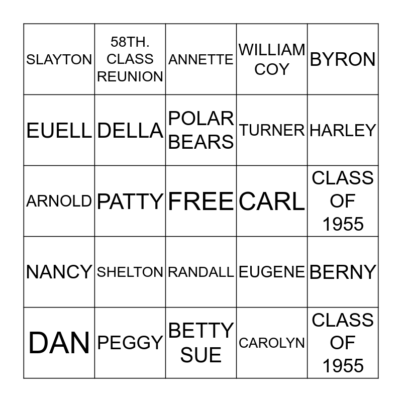 This bingo card has a free space and 24 words: SHELTON, PEGGY, POLAR BEARS, DAN, BYRON, SLAYTON, EUELL, 58TH. CLASS REUNION, CARL, RANDALL, TURNER, ARNOLD, EUGENE, BERNY, DELLA, CAROLYN, CLASS OF 1955, ANNETTE, HARLEY, PATTY, CLASS OF 1955, NANCY, WILLIAM COY and BETTY SUE.