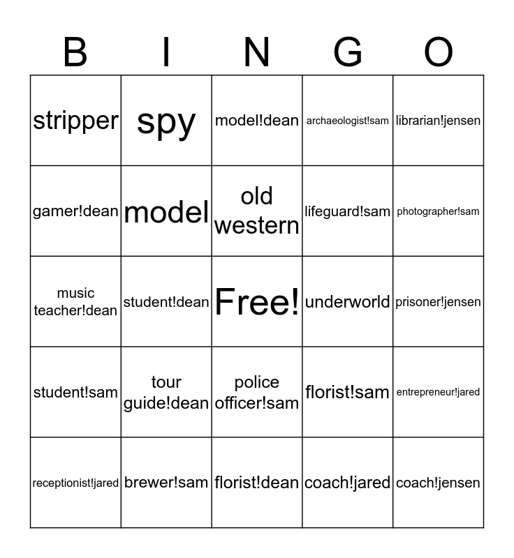 This bingo card has a free space and 346 words: cyborg, animal, apocalypse, aristocrat, farm, beach, corporate america, circus, college, culinary school, elf, fairy, fairytale, futuristic, genderbend, high school, hospital, identity theft, insanity, quest, kingdom, lawyer, mafia, magic, domestic, mythology, god/goddess, old western, utopia, pirate, time loop, show business, burlesque, space, steampunk, underworld, after life, war, zombie, bakery, bookstore, coffee shop, flowershop, haunted house, merpeople, prison, rockstar, roommate, single parent, spy, werewolf, victorian, wonderland, mental hospital, disney princess/princess, cattle ranch, historical, hacker, tattoo artist, bartender, model, photographer, sports, escort, stripper, mechanic, mobster, celebrity, vampire, friends to lovers, arranged marriaged, accidently marriage, fake married, geek/jock pairing, doppelgangers, soulmates, secret identity, enemies to friends to lovers, superpowers, fake relationship, a/b/o, parallel universes colliding, internet dating, fake dating, roommates, neighbors, mute/deaf, workplace romance, actor!dean, ambulance officer!dean, archaeologist!dean, architect!dean, art teacher!dean, author!dean, baker!dean, bartender!dean, brewer!dean, tattoo artist!dean, book/news editor!dean, cafe owner!dean, chef!dean, theater manager!dean, copywriter!dean, vegas card dealer!dean, director!dean, diver!dean, early childhood teacher!dean, entrepreneur!dean, fashion designer!dean, firefighter!dean, fisherman!dean, florist!dean, fitness instructor!dean, flight attendant!dean, farmer!dean, gamer!dean, gamer developer!dean, gunsmith!dean, gunslinger!dean, graphic designer!dean, historian!dean, interior designer!dean, journalist!dean, librarian!dean, lifeguard!dean, model!dean, music teacher!dean, musician!dean, nurse!dean, photographer!dean, park ranger!dean, police officer!dean, primary school teacher!dean, publisher!dean, receptionist!dean, soldier!dean, coach!dean, taxi driver!dean, tour guide!dean, truck driver!dean, professor!dean, veterinarian!dean, mechanic!dean, web designer!dean, waiter!dean, zookeeper!dean, stripper!dean, escort!dean, prince!dean, king!dean, prisoner!dean, student!dean, rock star!dean, muesum curator!sam, actor!sam, ambulance officer!sam, archaeologist!sam, architect!sam, art teacher!sam, author!sam, baker!sam, bartender!sam, brewer!sam, tattoo artist!sam, book/news editor!sam, cafe owner!sam, chef!sam, theater manager!sam, copywriter!sam, vegas card dealer!sam, director!sam, diver!sam, early childhood teacher!sam, entrepreneur!sam, fashion designer!sam, firefighter!sam, fisherman!sam, florist!sam, fitness instructor!sam, flight attendant!sam, farmer!sam, gamer!sam, gamer developer!sam, gunsmith!sam, gunslinger!sam, graphic designer!sam, historian!sam, interior designer!sam, journalist!sam, librarian!sam, lifeguard!sam, model!sam, music teacher!sam, musician!sam, nurse!sam, photographer!sam, park ranger!sam, police officer!sam, primary school teacher!sam, publisher!sam, receptionist!sam, soldier!sam, coach!sam, taxi driver!sam, tour guide!sam, truck driver!sam, professor!sam, veterinarian!sam, mechanic!sam, web designer!sam, waiter!sam, zookeeper!sam, stripper!sam, prince!sam, king!sam, prisoner!sam, student!sam, rock star!sam, ambulance officer!jared, archaeologist!jared, architect!jared, art teacher!jared, author!jared, baker!jared, bartender!jared, brewer!jared, tattoo artist!jared, book/news editor!jared, cafe owner!jared, chef!jared, theater manager!jared, copywriter!jared, vegas card dealer!jared, director!jared, diver!jared, early childhood teacher!jared, entrepreneur!jared, fashion designer!jared, firefighter!jared, fisherman!jared, florist!jared, fitness instructor!jared, flight attendant!jared, farmer!jared, gamer!jared, gamer developer!jared, gunsmith!jared, gunslinger!jared, graphic designer!jared, historian!jared, interior designer!jared, journalist!jared, librarian!jared, lifeguard!jared, model!jared, music teacher!jared, musician!jared, nurse!jared, photographer!jared, park ranger!jared, police officer!jared, primary school teacher!jared, publisher!jared, receptionist!jared, soldier!jared, coach!jared, taxi driver!jared, tour guide!jared, truck driver!jared, professor!jared, veterinarian!jared, mechanic!jared, web designer!jared, waiter!jared, zookeeper!jared, stripper!jared, escort!jared, prince!jared, king!jared, prisoner!jared, student!jared, rock star!jared, ambulance officer!jensen, archaeologist!jensen, architect!jensen, art teacher!jensen, author!jensen, baker!jensen, bartender!jensen, brewer!jensen, tattoo artist!jensen, book/news editor!jensen, cafe owner!jensen, chef!jensen, theater manager!jensen, copywriter!jensen, vegas card dealer!jensen, director!jensen, diver!jensen, early childhood teacher!jensen, entrepreneur!jensen, fashion designer!jensen, firefighter!jensen, fisherman!jensen, florist!jensen, fitness instructor!jensen, flight attendant!jensen, farmer!jensen, gamer!jensen, gamer developer!jensen, gunsmith!jensen, gunslinger!jensen, graphic designer!jensen, historian!jensen, interior designer!jensen, journalist!jensen, librarian!jensen, lifeguard!jensen, model!jensen, music teacher!jensen, musician!jensen, nurse!jensen, photographer!jensen, park ranger!jensen, police officer!jensen, primary school teacher!jensen, publisher!jensen, receptionist!jensen, soldier!jensen, coach!jensen, taxi driver!jensen, tour guide!jensen, truck driver!jensen, professor!jensen, veterinarian!jensen, mechanic!jensen, web designer!jensen, waiter!jensen, zookeeper!jensen, stripper!jensen, escort!jensen, prince!jensen, king!jensen, prisoner!jensen, student!jensen and rock star!jensen.