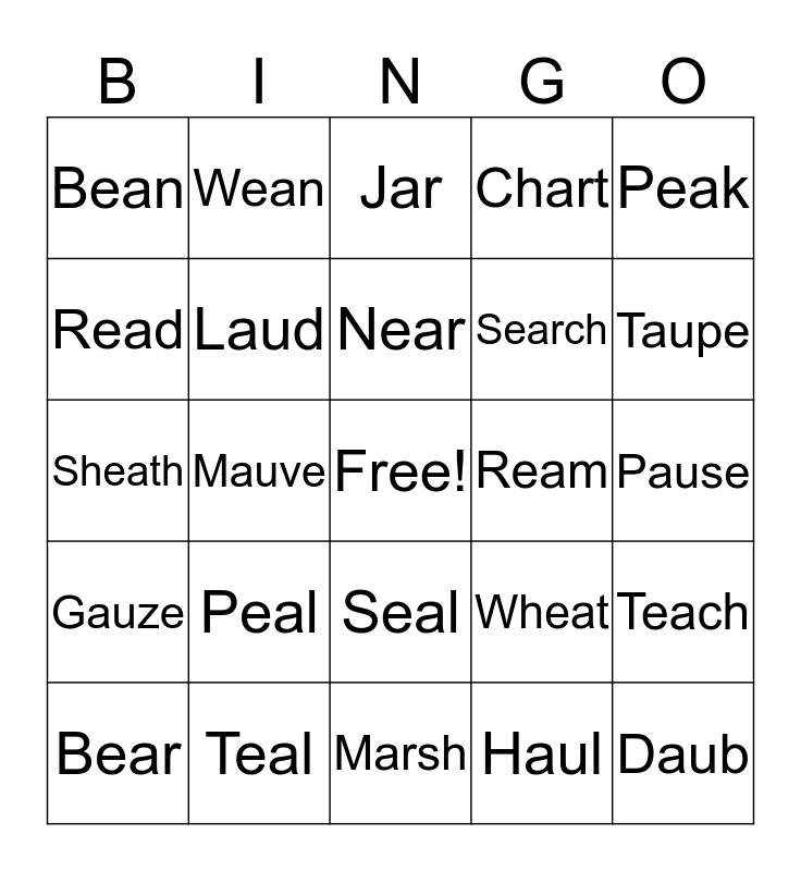 This bingo card has a free space and 24 words: Peal, Teal, Near, Bear, Peak, Bean, Read, Wean, Ream, Seal, Search, Sheath, Wheat, Teach, Laud, Haul, Pause, Jar, Taupe, Mauve, Daub, Gauze, Chart and Marsh.