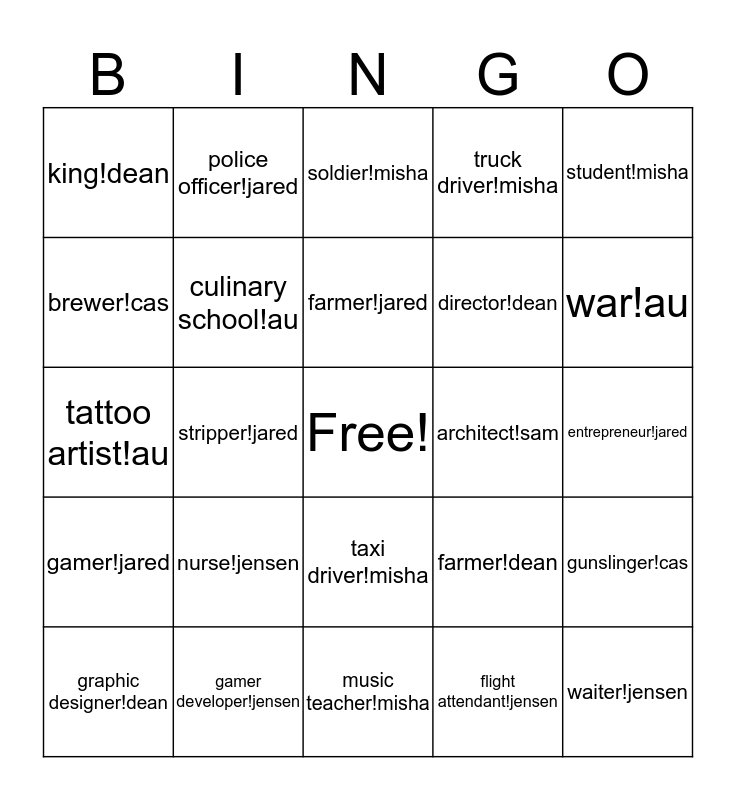 This bingo card has a free space and 460 words: apocalypse!au, aristocrat!au, farm!au, beach!au, corporate america!au, circus!au, college!au, culinary school!au, fairytale!au, futuristic!au, high school!au, hospital!au, insanity!au, kingdom!au, lawyer!au, mafia!au, magic!au, domestic!au, mythology!au, god/goddess!au, old western!au, pirate!au, show business!au, burlesque!au, steampunk!au, underworld!au, after life!au, war!au, zombie!au, bakery!au, bookstore!au, coffee shop!au, merpeople!au, prison!au, rockstar!au, roommate!au, single parent!au, spy!au, werewolf!au, victorian!au, wonderland!au, mental hospital!au, disney princess/princess!au, cattle ranch!au, historical!au, hacker!au, tattoo artist!au, bartender!au, model!au, photographer!au, sports!au, escort!au, stripper!au, mechanic!au, mobster!au, celebrity!au, vampire!au, friends to lovers, arranged marriaged, accidently marriage, fake married, geek/jock pairing, doppelgangers, soulmates, secret identity, enemies to friends to lovers, superpowers, fake relationship, a/b/o, parallel universes colliding, internet dating, fake dating, roommates, neighbors, mute/deaf, workplace romance, actor!dean, ambulance officer!dean, archaeologist!dean, architect!dean, art teacher!dean, author!dean, baker!dean, bartender!dean, brewer!dean, tattoo artist!dean, book/news editor!dean, cafe owner!dean, chef!dean, theater manager!dean, copywriter!dean, vegas card dealer!dean, director!dean, diver!dean, early childhood teacher!dean, entrepreneur!dean, fashion designer!dean, firefighter!dean, fisherman!dean, florist!dean, fitness instructor!dean, flight attendant!dean, farmer!dean, gamer!dean, gamer developer!dean, gunsmith!dean, gunslinger!dean, graphic designer!dean, historian!dean, interior designer!dean, journalist!dean, librarian!dean, lifeguard!dean, model!dean, music teacher!dean, musician!dean, nurse!dean, photographer!dean, park ranger!dean, police officer!dean, primary school teacher!dean, publisher!dean, receptionist!dean, soldier!dean, coach!dean, taxi driver!dean, tour guide!dean, truck driver!dean, professor!dean, veterinarian!dean, mechanic!dean, web designer!dean, waiter!dean, zookeeper!dean, stripper!dean, escort!dean, prince!dean, king!dean, prisoner!dean, student!dean, rock star!dean, muesum curator!sam, actor!sam, ambulance officer!sam, archaeologist!sam, architect!sam, art teacher!sam, author!sam, baker!sam, bartender!sam, brewer!sam, tattoo artist!sam, book/news editor!sam, cafe owner!sam, chef!sam, theater manager!sam, copywriter!sam, vegas card dealer!sam, director!sam, diver!sam, early childhood teacher!sam, entrepreneur!sam, fashion designer!sam, firefighter!sam, fisherman!sam, florist!sam, fitness instructor!sam, flight attendant!sam, farmer!sam, gamer!sam, gamer developer!sam, gunsmith!sam, gunslinger!sam, graphic designer!sam, historian!sam, interior designer!sam, journalist!sam, librarian!sam, lifeguard!sam, model!sam, music teacher!sam, musician!sam, nurse!sam, photographer!sam, park ranger!sam, police officer!sam, primary school teacher!sam, publisher!sam, receptionist!sam, soldier!sam, coach!sam, taxi driver!sam, tour guide!sam, truck driver!sam, professor!sam, veterinarian!sam, mechanic!sam, web designer!sam, waiter!sam, zookeeper!sam, stripper!sam, prince!sam, king!sam, prisoner!sam, student!sam, rock star!sam, ambulance officer!jared, archaeologist!jared, architect!jared, art teacher!jared, author!jared, baker!jared, bartender!jared, brewer!jared, tattoo artist!jared, book/news editor!jared, cafe owner!jared, chef!jared, theater manager!jared, copywriter!jared, vegas card dealer!jared, director!jared, diver!jared, early childhood teacher!jared, entrepreneur!jared, fashion designer!jared, firefighter!jared, fisherman!jared, florist!jared, fitness instructor!jared, flight attendant!jared, farmer!jared, gamer!jared, gamer developer!jared, gunsmith!jared, gunslinger!jared, graphic designer!jared, historian!jared, interior designer!jared, journalist!jared, librarian!jared, lifeguard!jared, model!jared, music teacher!jared, musician!jared, nurse!jared, photographer!jared, park ranger!jared, police officer!jared, primary school teacher!jared, publisher!jared, receptionist!jared, soldier!jared, coach!jared, taxi driver!jared, tour guide!jared, truck driver!jared, professor!jared, veterinarian!jared, mechanic!jared, web designer!jared, waiter!jared, zookeeper!jared, stripper!jared, escort!jared, prince!jared, king!jared, prisoner!jared, student!jared, rock star!jared, ambulance officer!jensen, archaeologist!jensen, architect!jensen, art teacher!jensen, author!jensen, baker!jensen, bartender!jensen, brewer!jensen, tattoo artist!jensen, book/news editor!jensen, cafe owner!jensen, chef!jensen, theater manager!jensen, copywriter!jensen, vegas card dealer!jensen, director!jensen, diver!jensen, early childhood teacher!jensen, entrepreneur!jensen, fashion designer!jensen, firefighter!jensen, fisherman!jensen, florist!jensen, fitness instructor!jensen, flight attendant!jensen, farmer!jensen, gamer!jensen, gamer developer!jensen, gunsmith!jensen, gunslinger!jensen, graphic designer!jensen, historian!jensen, interior designer!jensen, journalist!jensen, librarian!jensen, lifeguard!jensen, model!jensen, music teacher!jensen, musician!jensen, nurse!jensen, photographer!jensen, park ranger!jensen, police officer!jensen, primary school teacher!jensen, publisher!jensen, receptionist!jensen, soldier!jensen, coach!jensen, taxi driver!jensen, tour guide!jensen, truck driver!jensen, professor!jensen, veterinarian!jensen, mechanic!jensen, web designer!jensen, waiter!jensen, zookeeper!jensen, stripper!jensen, escort!jensen, prince!jensen, king!jensen, prisoner!jensen, student!jensen, rock star!jensen, ambulance officer!misha, archaeologist!misha, architect!misha, art teacher!misha, author!misha, baker!misha, bartender!misha, brewer!misha, tattoo artist!misha, book/news editor!misha, cafe owner!misha, chef!misha, theater manager!misha, copywriter!misha