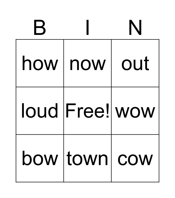 This bingo card has a free space and 8 words: wow, out, now, bow, how, cow, loud and town.