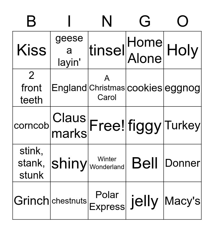 This bingo card has a free space and 24 words: shiny, chestnuts, A Christmas Carol, Grinch, Holy, Kiss, 2 front teeth, geese a layin', figgy, Winter Wonderland, cookies, corncob, Bell, Donner, England, jelly, Turkey, tinsel, eggnog, Claus marks, Macy's, stink, stank, stunk, Home Alone and Polar Express.
