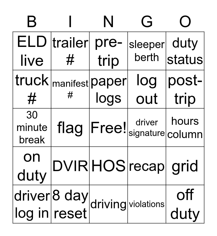 This bingo card has a free space and 24 words: DVIR, 8 day reset, paper logs, driver log in, duty status, ELD live, truck #, trailer #, driver signature, HOS, log out, 30 minute break, recap, grid, manifest #, violations, hours column, pre-trip, post-trip, flag, off duty, on duty, sleeper berth and driving.