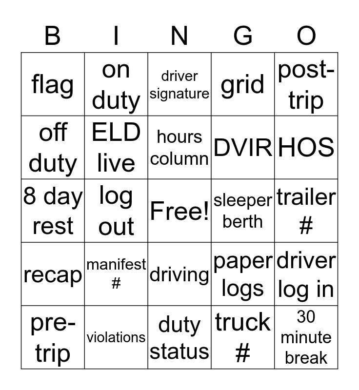 This bingo card has a free space and 24 words: manifest #, violations, hours column, pre-trip, post-trip, flag, off duty, on duty, sleeper berth, driving, DVIR, 8 day rest, paper logs, driver log in, ELD live, truck #, trailer #, driver signature, HOS, log out, 30 minute break, recap, grid and duty status.