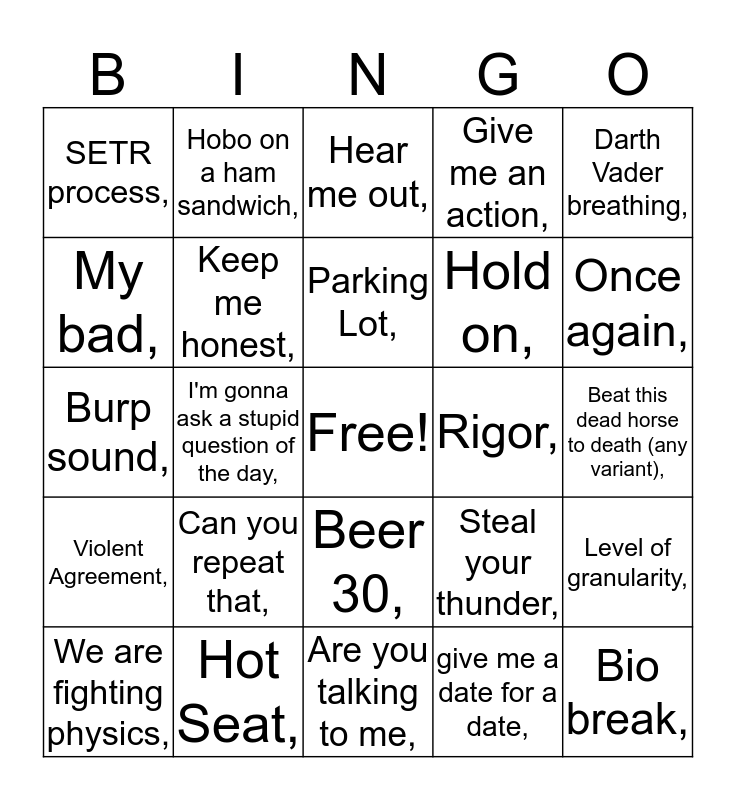 This bingo card has a free space and 35 words: Caca,, Pull the thread,, Rabbits Hole,, Keep me honest,, Beer 30,, Give me an action,, My bad,, Sir Ma’ma Sir Caca,, Parking Lot,, Dog or Cat sound,, Burp sound,, Darth Vader breathing,, Hot Mic,, Snowflake,, SETR process,, Rigor,, give me a date for a date,, I'm gonna ask a stupid question of the day,, Violent Agreement,, Bio break,, Steal your thunder,, We are fighting physics,, Level of granularity,, Hot Seat,, Hear me out,, Once again,, I totally get it,, Wait a minute,, Hold on,, Beat this dead horse to death (any variant),, Don’t tell me,, Are you talking to me,, Can you repeat that,, Hobo on a ham sandwich, and Rat on a cheeto.